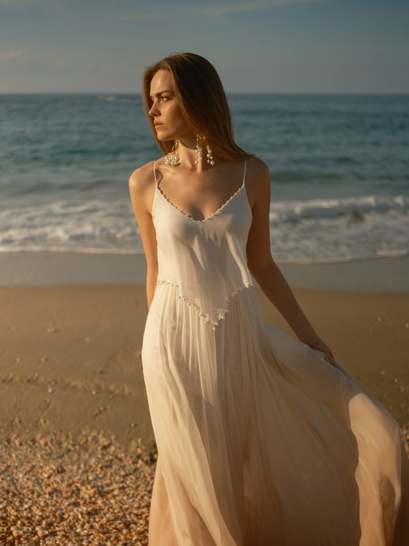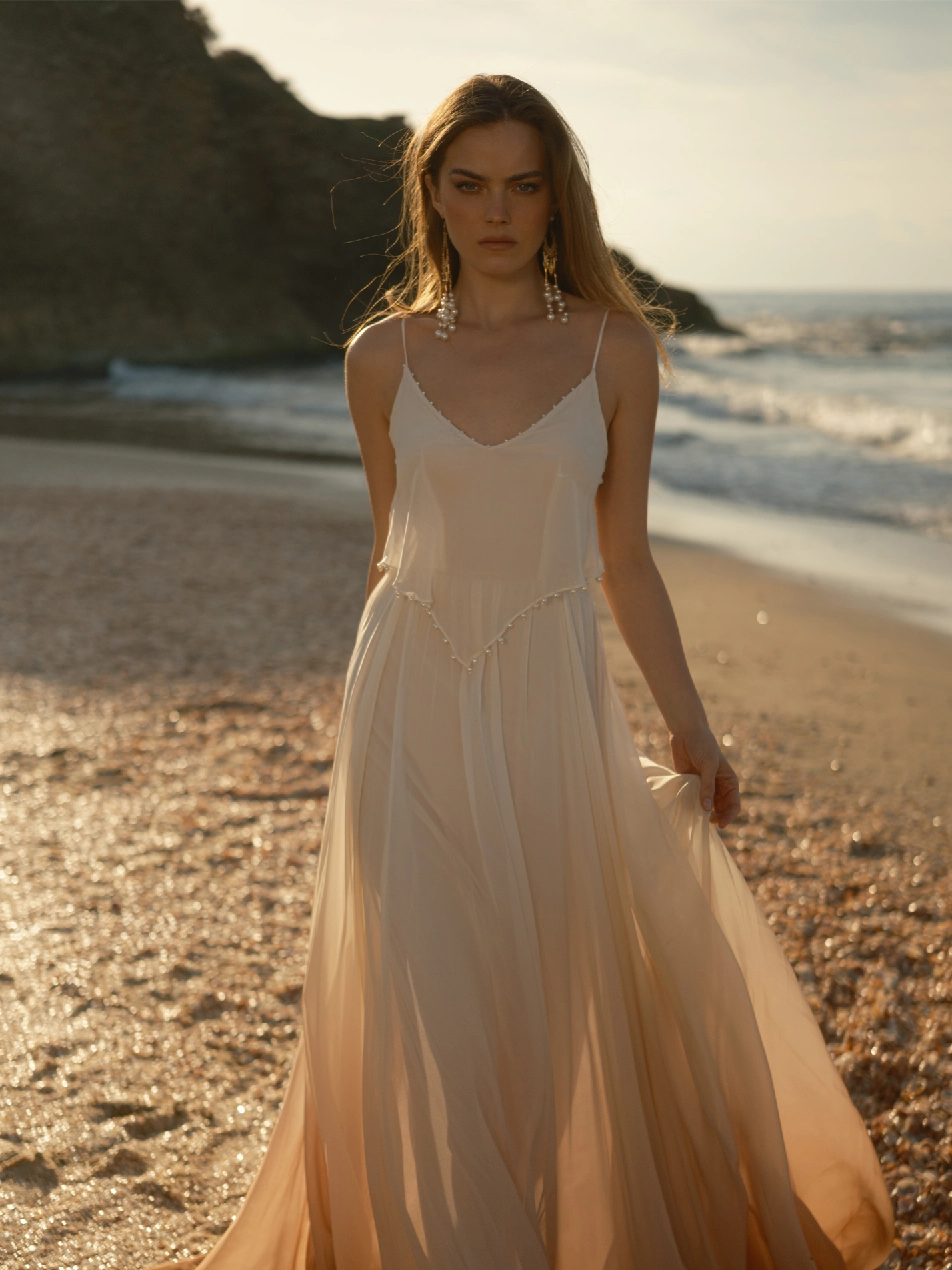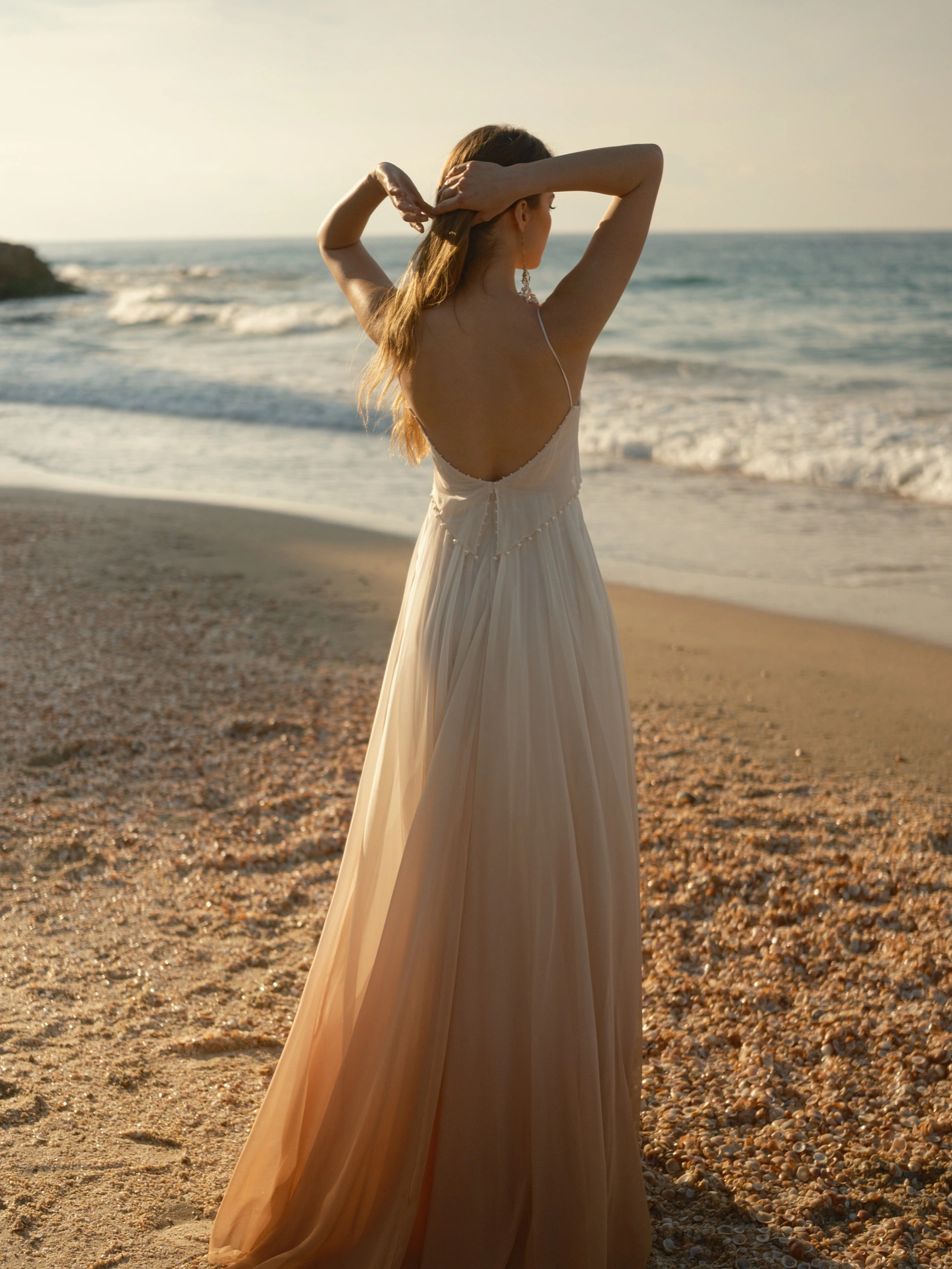 #TwelveOmbréByRish is a bohemian wedding gown designed for the bride seeking a unique look. This dress harmoniously blends understated elegance with artistic details, ensuring a captivating presence as you walk down the aisle. The V-neckline, adorned with delicate pearl accents, complements the layered V-shaped bodice, also trimmed with pearls. The flowing chiffon skirt showcases a graceful ombré transition from ivory to a rich camel brown, creating a unique visual effect. Completing the design, the low V-back, highlighted with pearl embellishments, enhances the gown’s allure, making it an ideal choice for the bride who wants to make a statement.