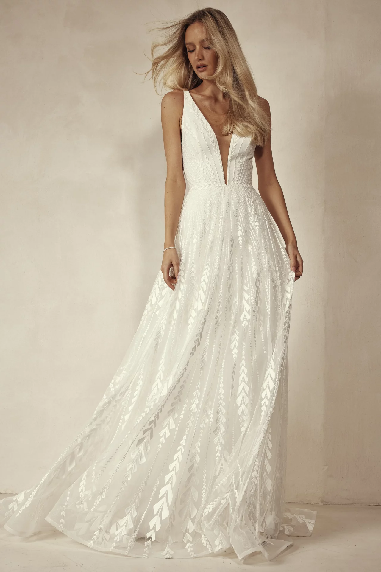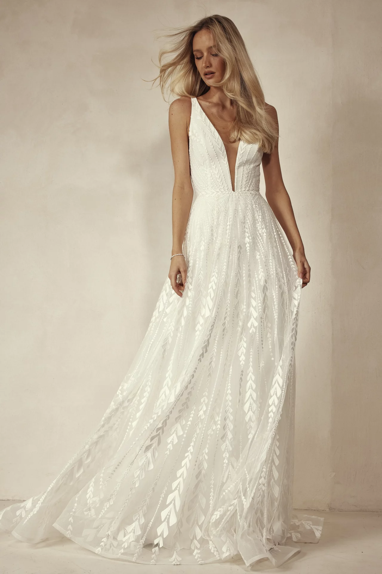 #ScottyByRish is a classic bridal style in lace with a modern twist! A plunging V-neckline and low V-back add a sexy touch, while vine motifs on the lace add a natural element. A fitted skirt is overlayed with a semi-sheer lace A-line skirt for a look that is sure to turn heads.